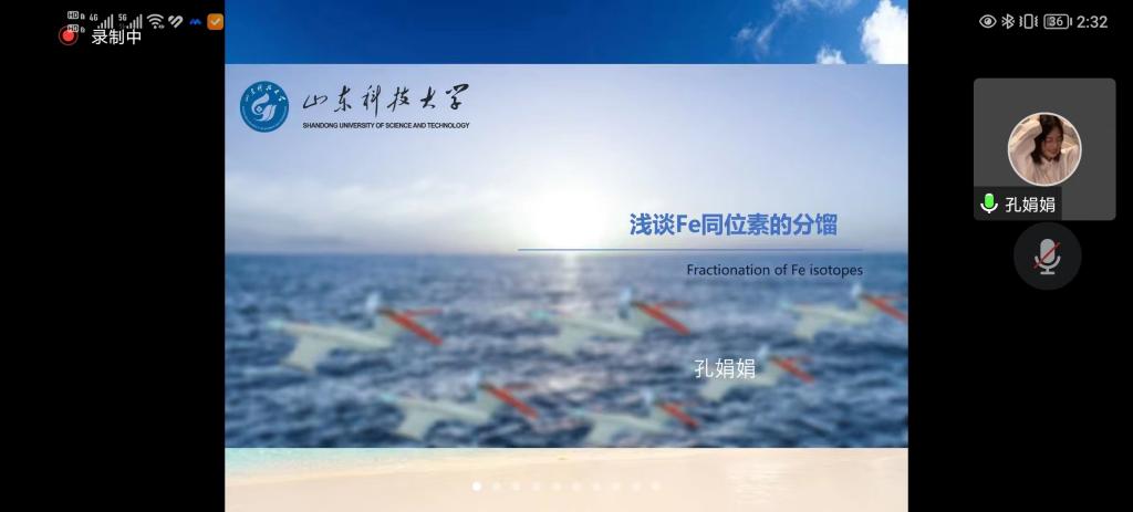 2022年11月6日下午,中文字幕无码视频第四期海洋论坛活动在线上举行,本次活动邀请来自山东科技大学孔娟娟博士为我院师生做了题为《浅谈Fe同位素分馏》的学术报告。会议由海洋生物资源教学部马瑶博士主持,学院党委副书记、副院长孙胜显出席会议。参会成员为海洋资源与环境专业全体师生。
