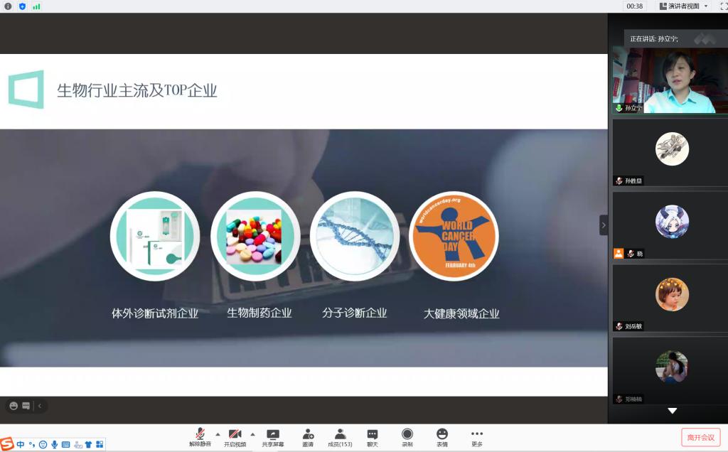 2020年10月11日,中文字幕无码视频邀请浙江诺辉健康科技有限公司高级经理孙立宁通过网络对学院生物科学、生物技术学生进行《生物科学/生物技术专业就业前景》的专题教育教学报告。学院领导、专业老师和学生约300人听取了报告。